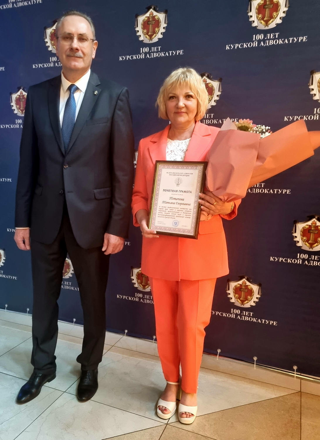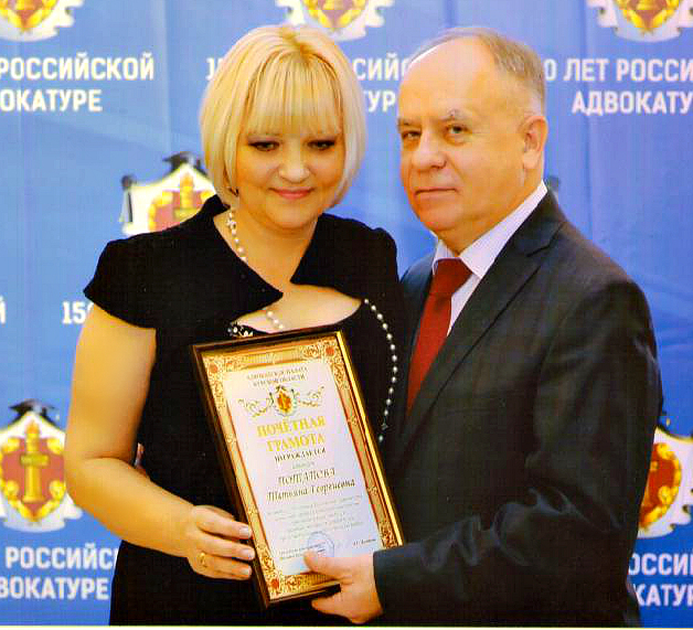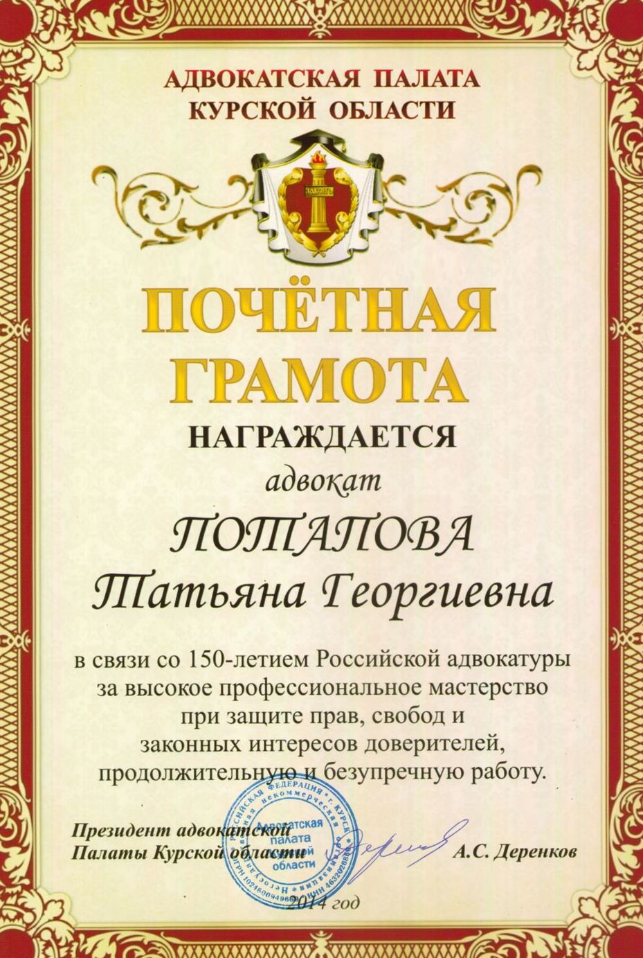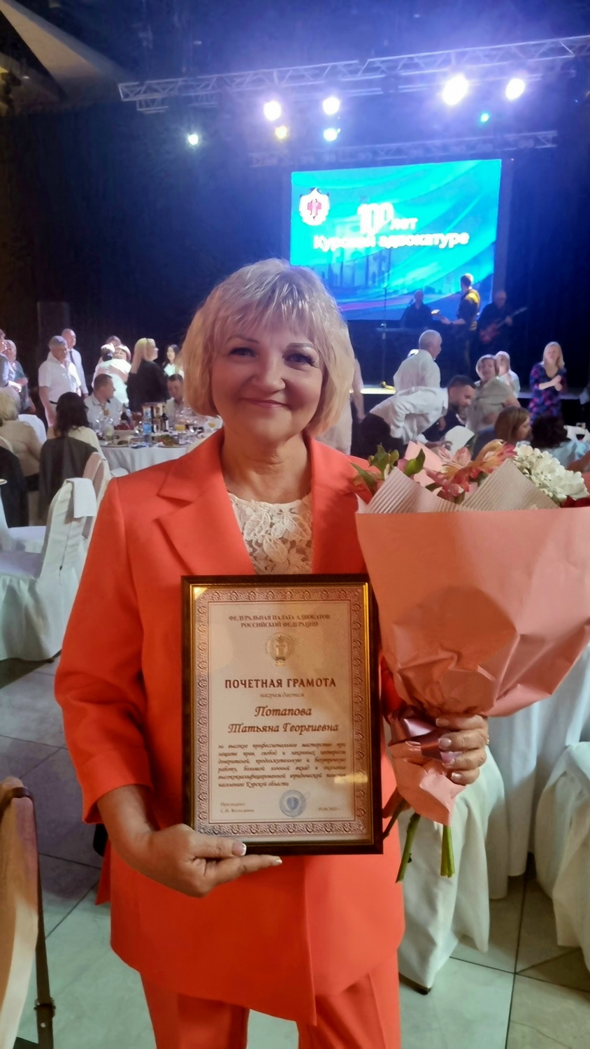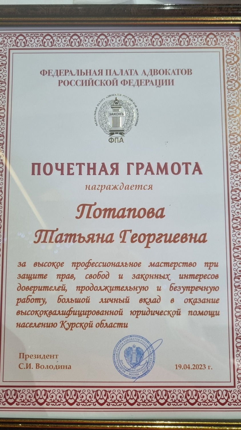 Мой регистрационный номер 46/647 в реестре адвокатов Курской области. В 2006 году окончила Курский государственный университет. С 2006 г. по 2008 г. работала стажером адвоката в Курской городской коллегии адвокатов № 1. С 2009 г. по 2010 г. работала адвокатом в Курской городской коллегии адвокатов № 1. С 17.10.2009 г. по 22.12.2009г. прошла обучение в Курском государственном университете по программе повышения квалификации "Адвокатская компетентность". С 2010 г. по 2016 г. работала адвокатом в Курской городской коллегии адвокатов. В 2014 году за высокое профессиональное мастерство при защите прав, свобод и законных интересов доверителей, продолжительную и безупречную работу награждена почетной грамотой Адвокатской палаты Курской области. С 25.09.2015г. по 25.12.2015 г. прошла обучение в Региональном открытом социальном институте по программе повышения квалификации адвокатов Курской области. В 2015 году Председателем Курской областной организации Всероссийского ордена Трудового Красного Знамени общества слепых выражена благодарность за оказанную бесплатную юридическую помощь инвалидам I - II группы по зрению г. Курска и Курской области, высокий профессионализм и понимание проблем людей с ограниченными физическими возможностями. С 1 ноября 2016 года учредила Адвокатский кабинет "Адвокат Потапова Татьяна Георгиевна". В 2023 году за высокое профессиональное мастерство при защите прав, свобод и законных интересов доверителей, продолжительную и безупречную работу награждена почетной грамотой Федеральной палаты адвокатов Российской Федерации.