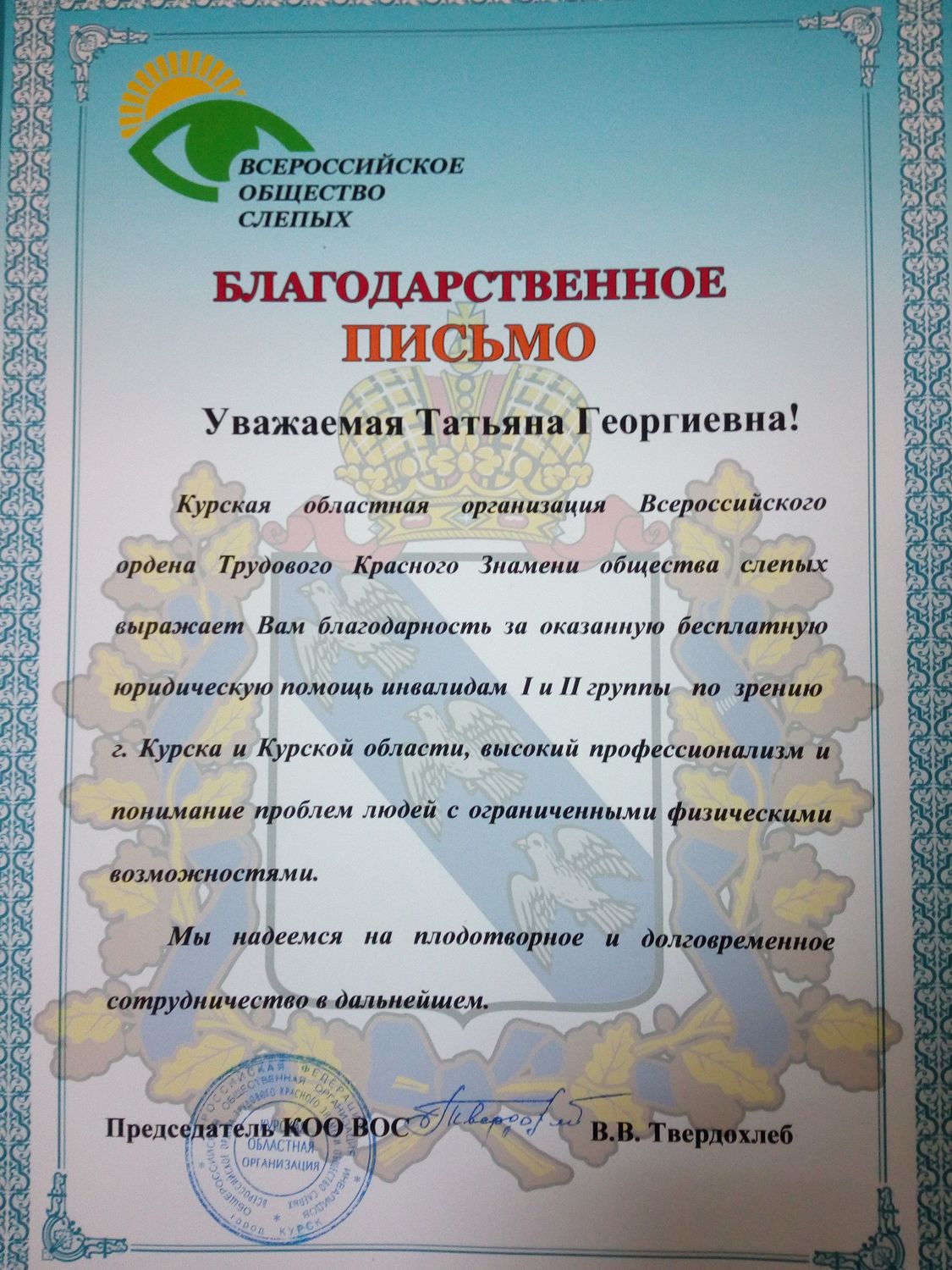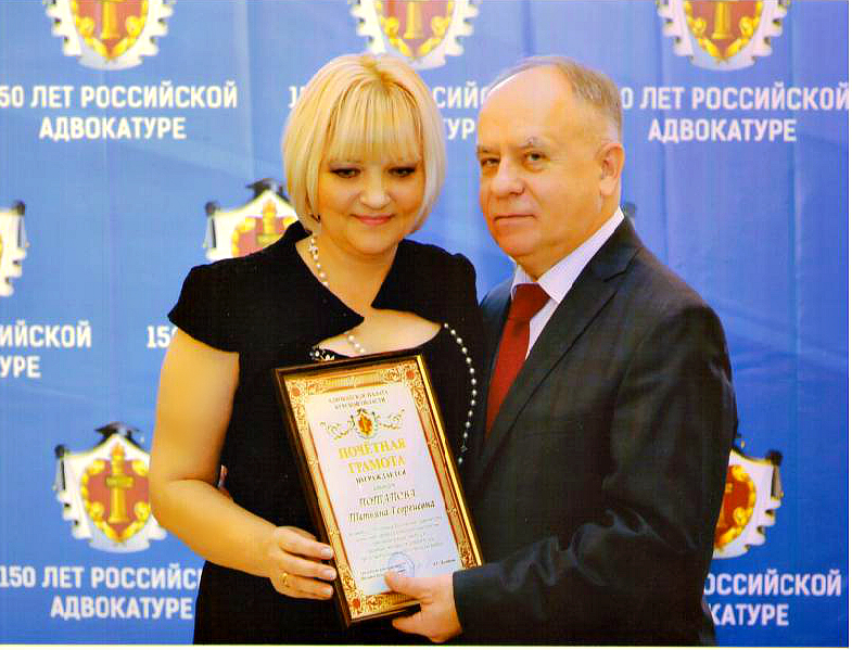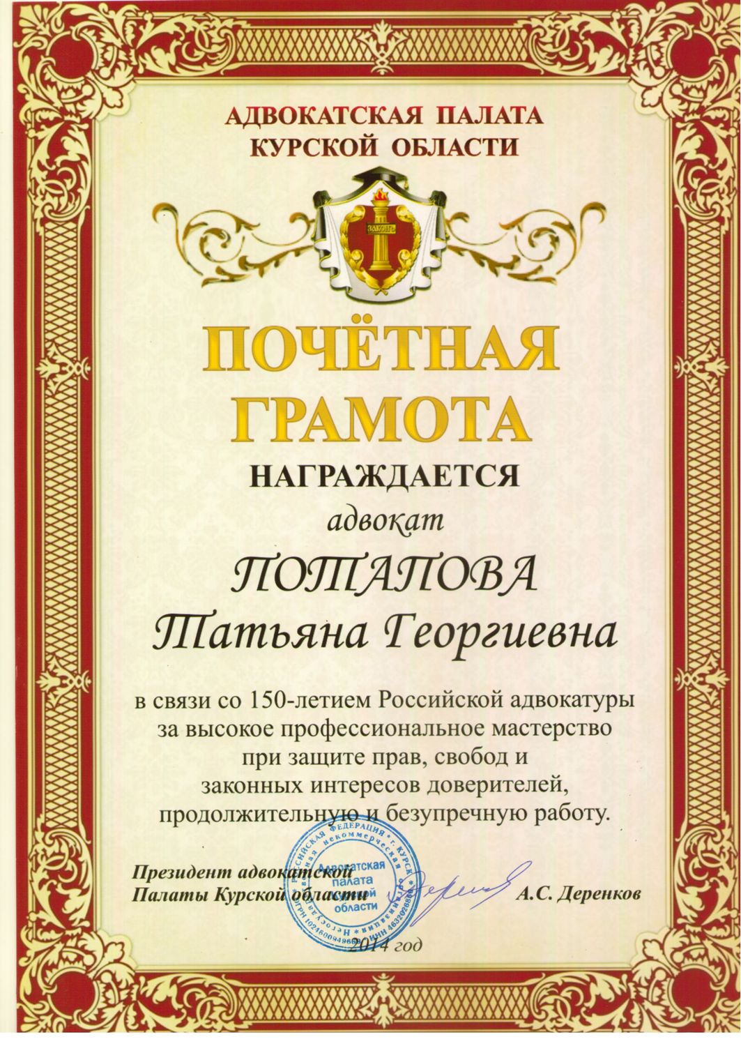 Мой регистрационный номер 46/647 в реестре адвокатов Курской области. В 2006 году окончила Курский государственный университет. С 2006 г. по 2008 г. работала стажером адвоката в Курской городской коллегии адвокатов № 1. С 2009 г. по 2010 г. работала адвокатом в Курской городской коллегии адвокатов № 1. С 17.10.2009 г. по 22.12.2009г. прошла обучение в Курском государственном университете по программе повышения квалификации "Адвокатская компетентность". С 2010 г. по 2016 г. работала адвокатом в Курской городской коллегии адвокатов. В 2014 году за высокое профессиональное мастерство при защите прав, свобод и законных интересов доверителей, продолжительную и безупречную работу награждена почетной грамотой Адвокатской палаты Курской области. С 25.09.2015г. по 25.12.2015 г. прошла обучение в Региональном открытом социальном институте по программе повышения квалификации адвокатов Курской области. В 2015 году Председателем Курской областной организации Всероссийского ордена Трудового Красного Знамени общества слепых выражена благодарность за оказанную бесплатную юридическую помощь инвалидам I - II группы по зрению г. Курска и Курской области, высокий профессионализм и понимание проблем людей с ограниченными физическими возможностями. С 1 ноября 2016 года учредила Адвокатский кабинет "Адвокат Потапова Татьяна Георгиевна". В 2023 году за высокое профессиональное мастерство при защите прав, свобод и законных интересов доверителей, продолжительную и безупречную работу награждена почетной грамотой Федеральной палаты адвокатов Российской Федерации.
